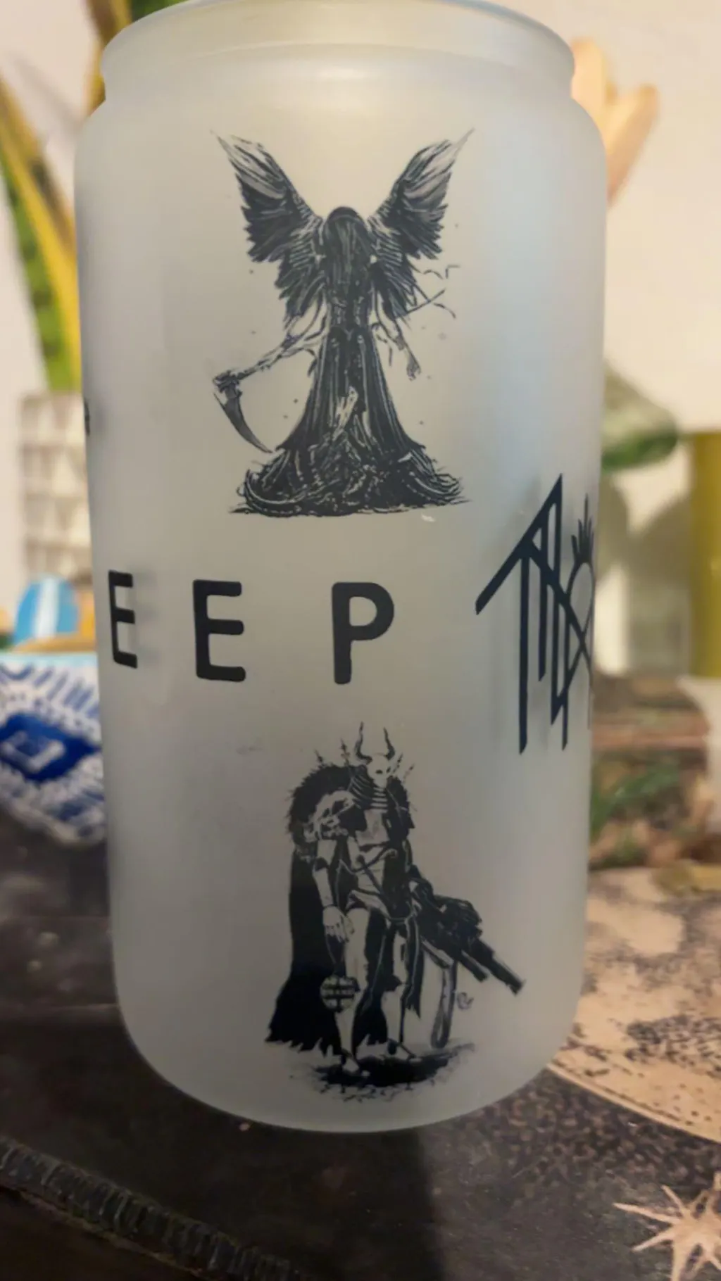 Elevate your daily hydration with our exclusive frosted glass can, featuring intricate, dark-aesthetic illustrations inspired by the atmospheric world of Sleep Token. Designed for fans who appreciate the "Ritual" aesthetic, this glass features iconic sigils and ethereal figures that wrap seamlessly around the frosted finish.