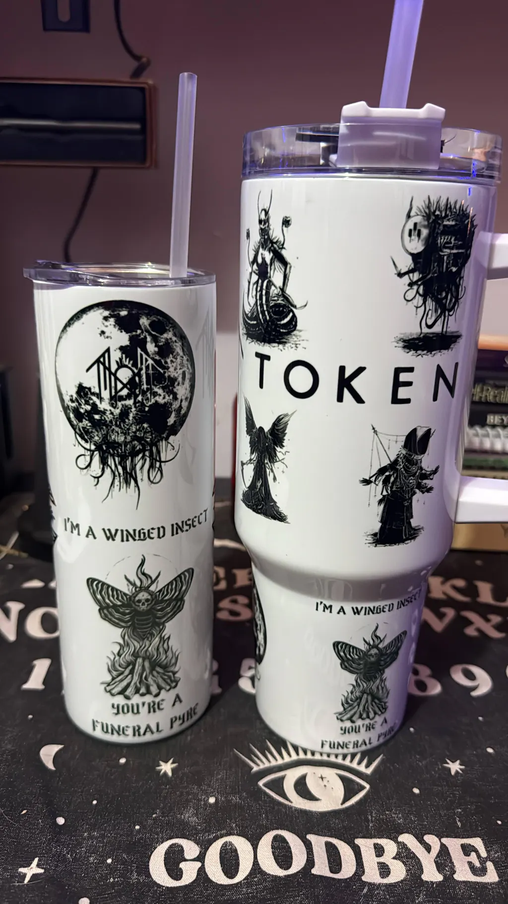 Detailed black and white Sleep Token inspired 40oz tumbler with handle and lore inspired  illustrations.